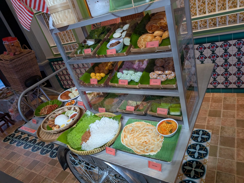 マレーシア館の紹介に戻ると、最初の部屋はペラナカン建築を模した壁に沿って、マレーシア各地の料理のサンプルが多数並べられています。この間シンガポールに行ったときに食べた「ナシレマ」もありました。