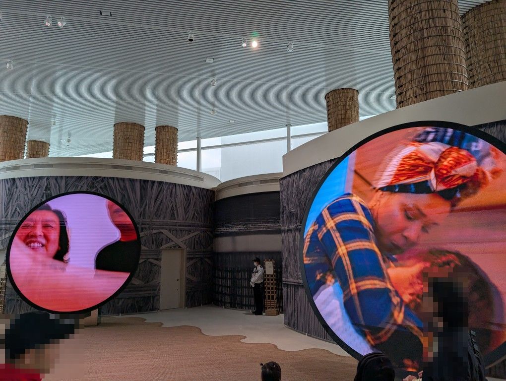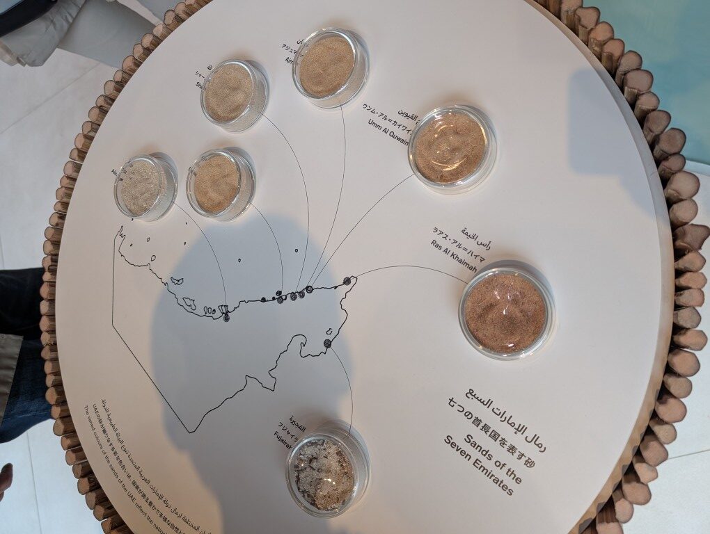 展示の中には、UAE各地の砂のサンプルなんかも展示されていました(場所によって微妙に色が違う)。奥の方の円形スクリーンでは、様々なUAE国民を動画で紹介。