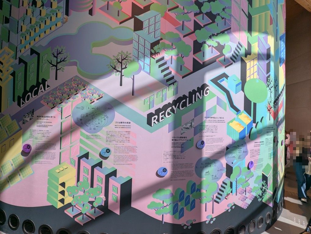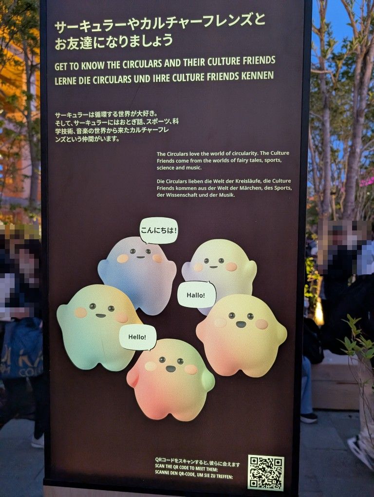 さて、入口では「サーキュラー」というマスコットを渡され、各自これを持って展示を見ます。ちなみにサーキュラー君は相当人気があるようで、グッズを持っている人を会場内でよく見かけました。筆者の見た限り、ミャクミャクを除く万博のキャラグッズの中では人気ナンバーワンではないかと思います。
