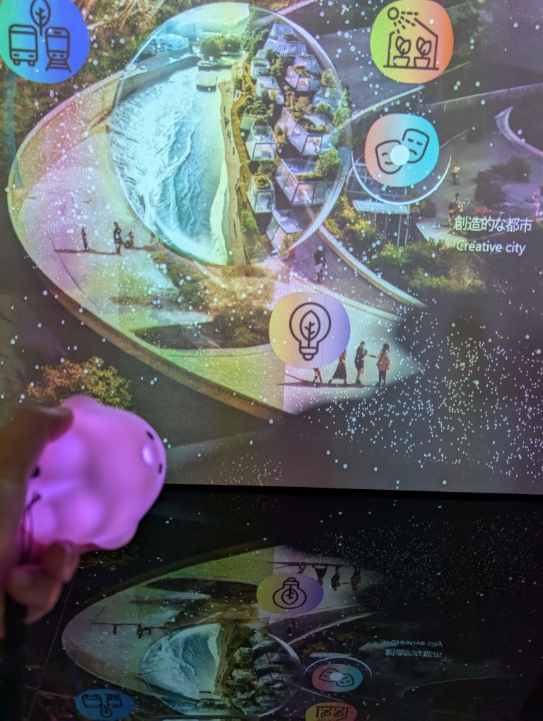 インドネシアの人々の顔写真や、各地の伝統的な刀剣を展示するエリアがあった後、未来都市のジオラマとプロジェクションマッピングを組み合わせた幻想的なエリアに出ました。