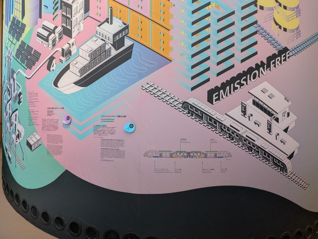 館内はドイツの各地域、そしてモビリティやエネルギーなど様々な産業セクタにおける環境保護の取り組みに関する話題が中心です。パネルには事細かに説明が書かれ、その姿とは裏腹に(?)サーキュラー君の説明も込み入った内容が多いです。お子様にはかなり難解な内容ですし、大人でも全部の説明を聞いて理解するのは大変でしょう。