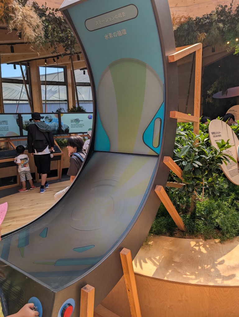 電力館はタイトルの通り、光るタマゴを持ってミニゲームに参加し、ポイントを集めていくというパビリオンです。ミニゲームは科学館、大阪だと扇町のキッズプラザあたりにありそうな感じのもので、正直言って大人一人で来るべきところではなかったかもしれません。(当日予約が最後これしか取れず、やむを得なかったのですが)