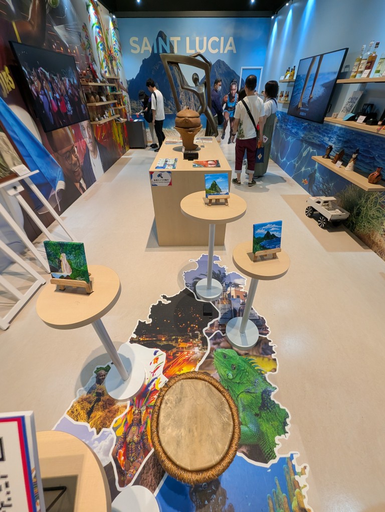 カリブ海の小国・セントルシアのブース中央には、箱根彫刻の森にでもありそうな(?)ブロンズ像がありました。奥の方にあるのは、同国初のオリンピック金メダリストの女性の等身大パネルです。
