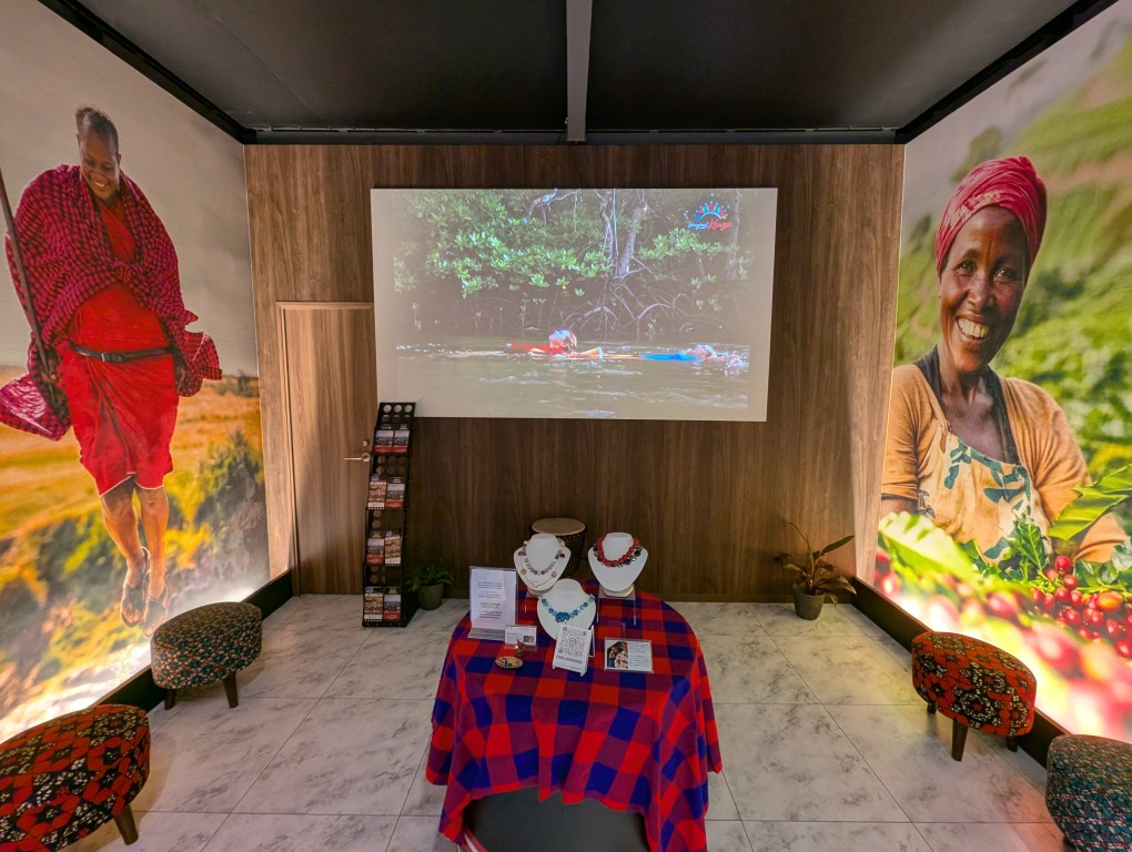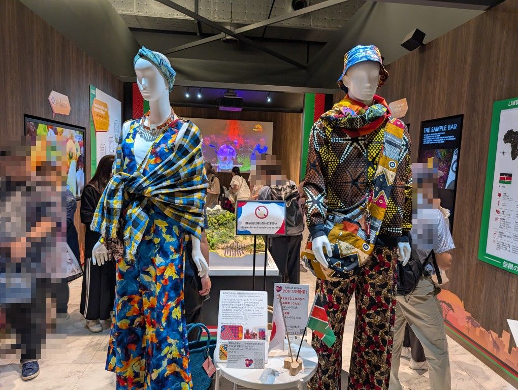 入口では、ケニアらしいのかどうなのか分からないけど派手な衣装を着たマネキンがお出迎え。奥ではケニアの自然風景を映像で紹介します。