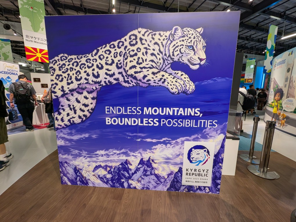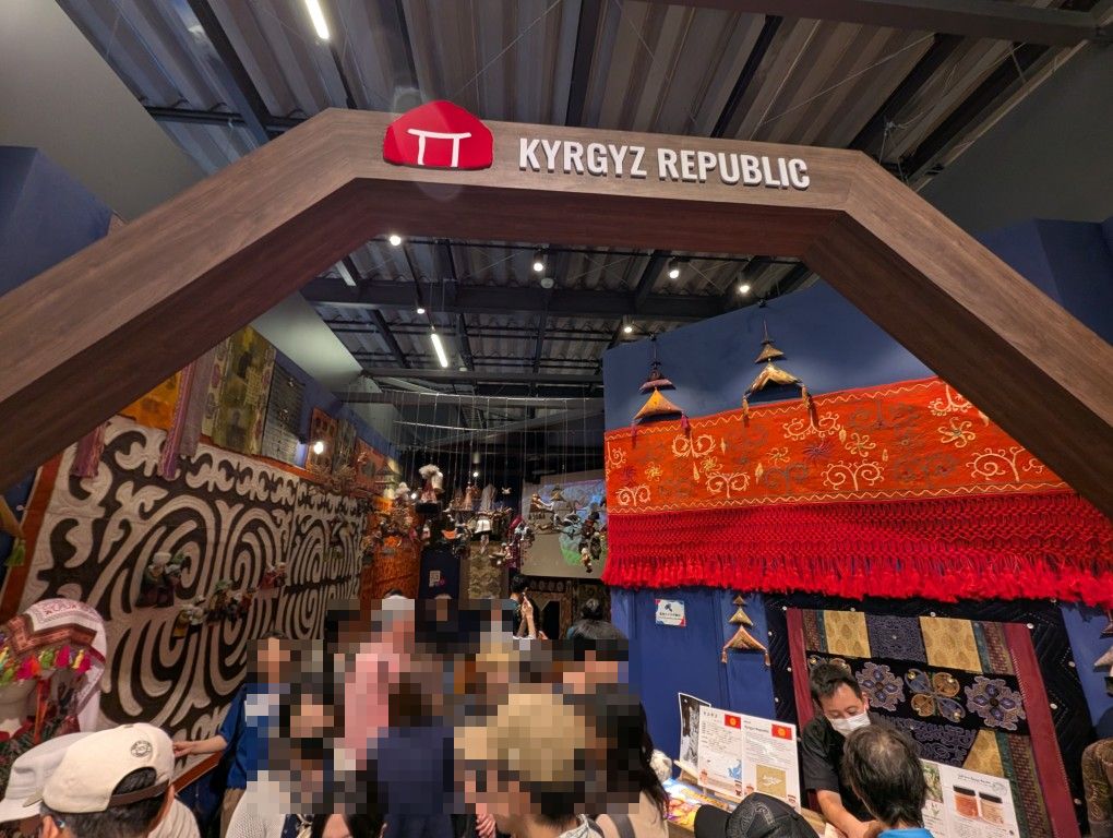 中央アジア・キルギスのブースは天井から大量のオブジェが吊るされているのが印象的。巨大スクリーンを用いた現地映像もあります。スクリーンの前にはカーペット敷きのエリアもあって、のんびり座って鑑賞することも可能。