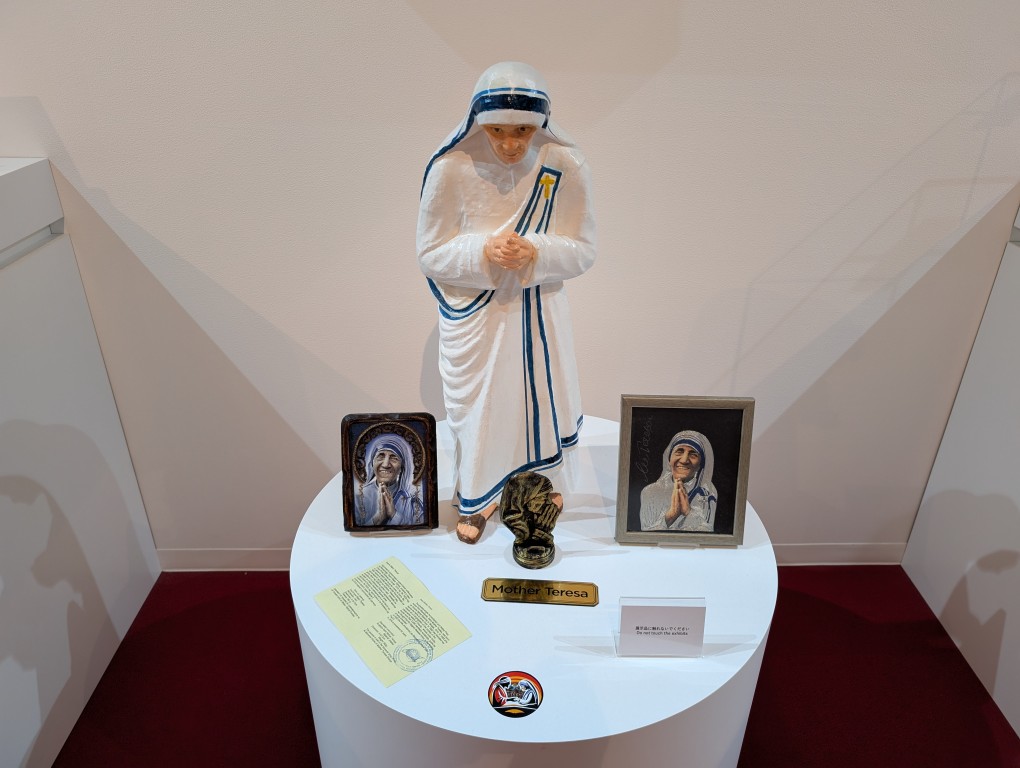 同国はキリスト教国なのか、マザーテレサや教会などキリスト教関連の展示も多いです。一角にあるモニタでは、同国の名所や料理などを紹介(ただし英語のみ)。
