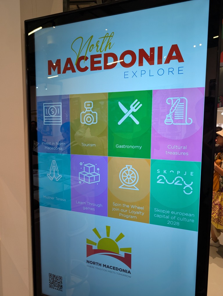 太陽のような国旗が特徴的な北マケドニアのブースでは、首都スコビエの都市計画を模型で紹介。