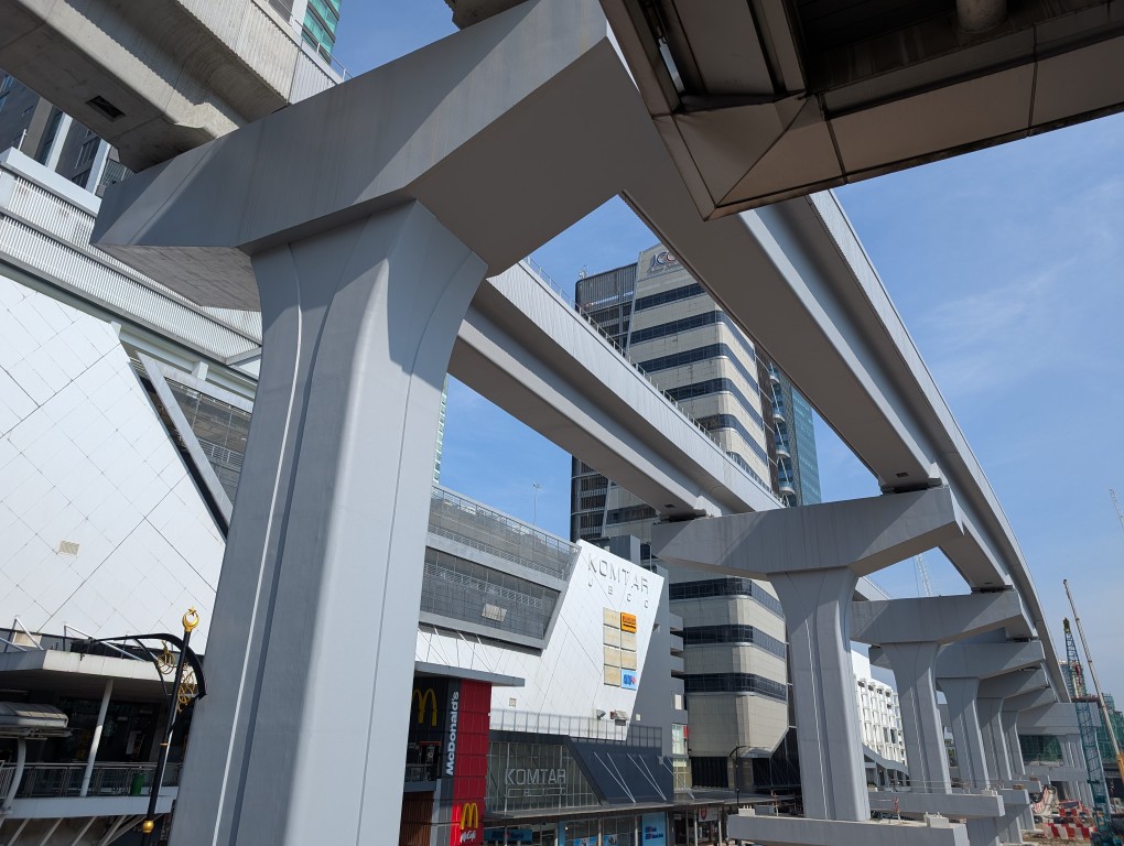 駅を出ると、上空に高架橋を建設している様子が見えました。高速道路にしては妙に桁の幅が狭く、一体何だろうと思っていたのですが、後で調べてみるとWoodlands North駅からジョホールバルを結ぶRTSという新線のようです。2026年末には完成予定で、単線で輸送力に限界のある”KTM Shuttle Tebrau”を置き換えるそうです。