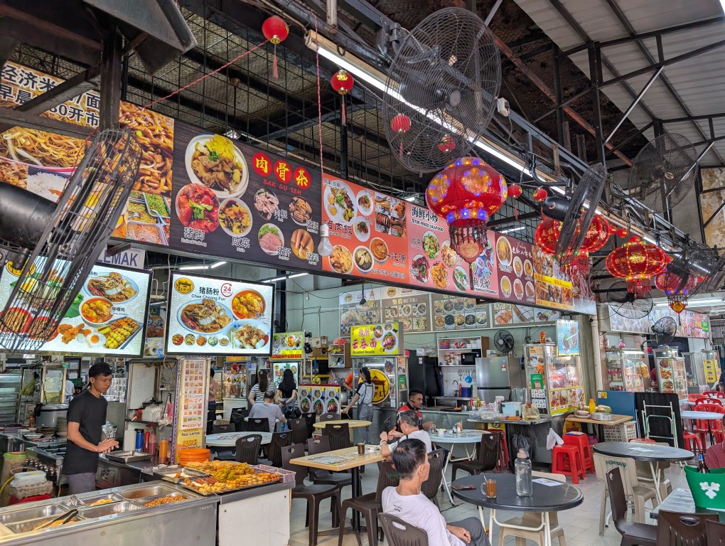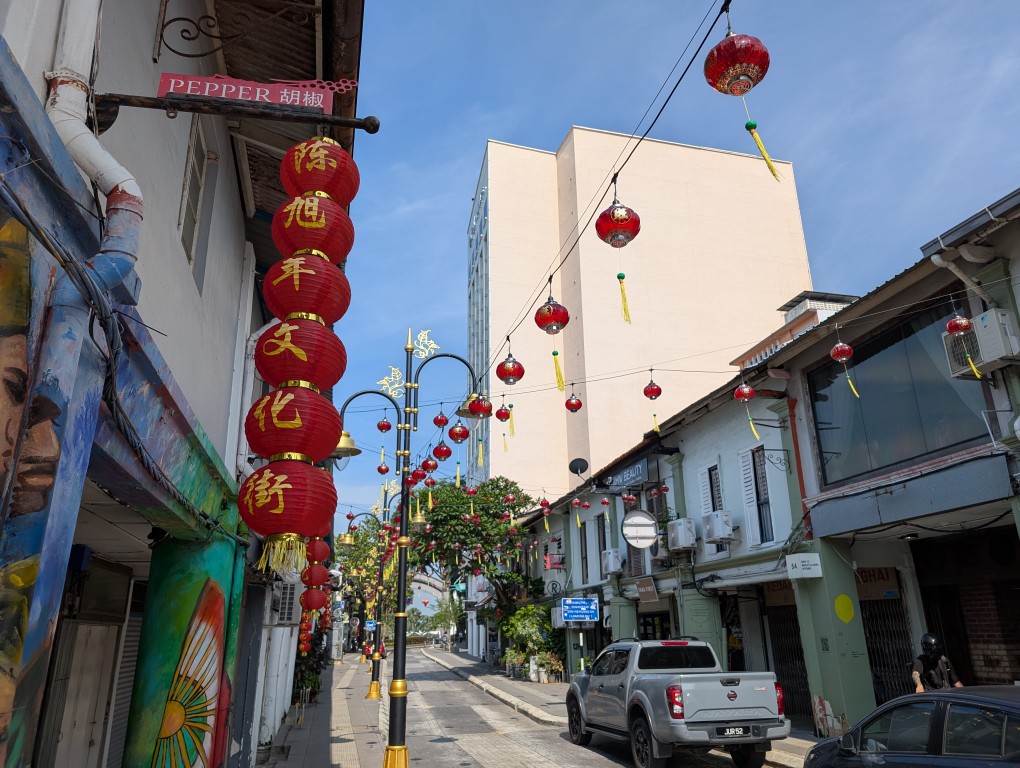 さらに南下していくと、中華風の飾り付けがされた通りに出ます。通り沿いにはフードコートも営業していますが、若干ドブのような匂いがするのが気になりました… この後シンガポールでも各所を巡りましたが匂いは全然気にならなかったので、このあたりも格差を感じました。