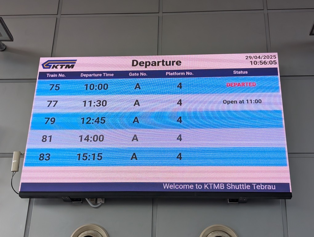 駅に戻り、11時30分発の列車に乗ります。改札は30分ほど前から始まり、マレーシアの出国手続きを行います。行きはシンガポール側で出入国両方の手続きを行いましたが、シンガポールの入国手続きはシンガポールに到着後行うようです。