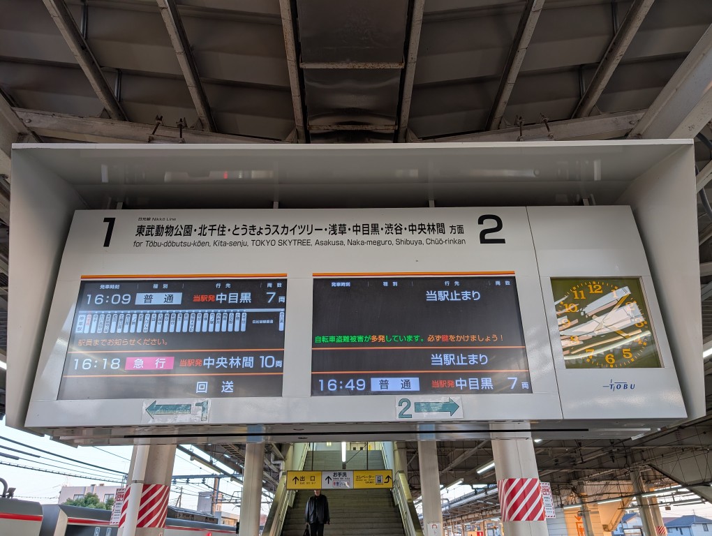 羽生から東武動物公園に戻り、日光線の南栗橋までの各駅もついでに巡ってきました。しかし、都心から距離のある南栗橋で「中目黒」「中央林間」といった行き先が並んでいるのを見るとなかなか違和感があります…