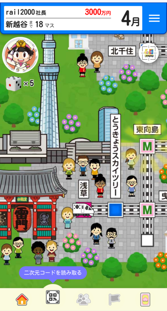 まず、ゲーム期間は1年(12か月)で、上半期と下半期でそれぞれ1か所ずつ設定される目的地を目指します。ゲーム版桃鉄と同じく1か月に1回サイコロを振って目的地を目指すのですが、途中駅に止まると実際にその駅で下車し、駅改札口付近にある専用ポスターのQRコードを読み取る必要があります。読み取った時点でイベントが発生し、それが終わると次のサイコロを振ることができます。
