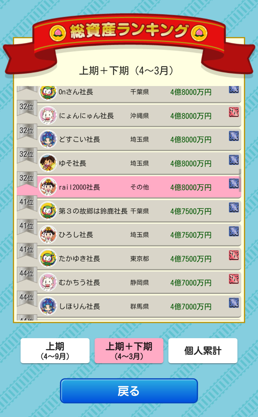 今回は全般的にサイコロの出目がよく、キングボンビーの被害にも遭わずに済んだので賞金のほうはかなり稼げ、クリア時点で32位にランクインすることができました。前回記事にも書いたとおり、リアル桃鉄は基本的にサイコロの出目任せの運ゲーで、戦略うんぬんで上位を狙えるものではないので、あくまで運がよかっただけかなと。