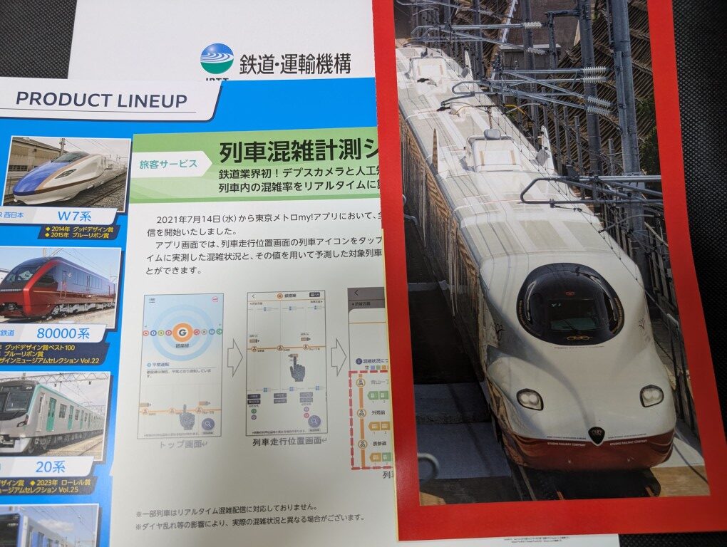 (写真1枚目)JR九州、鉄道・運輸機構、近畿車両、東京メトロのパンフ。東京メトロアプリに表示されるリアルタイム混雑状況は、ホーム設置のカメラで乗車状況を観測しているという話は面白かったです。他社だと車両設置の重量センサで混雑率を読み取っているところが多いのですが、東京メトロは他社線の乗り入れが多く、車両から情報を取るのが難しいためカメラを使っているそう。