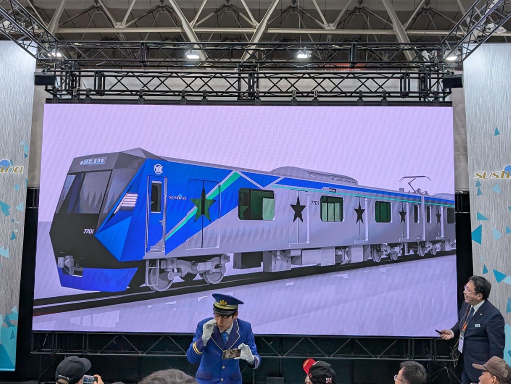 (写真1つ目)総合車両製作所では、E235系や東急2020系などに用いられるステンレス車体”sustina”をアピールしていたほか、ステージイベントも行っていました(後述)。