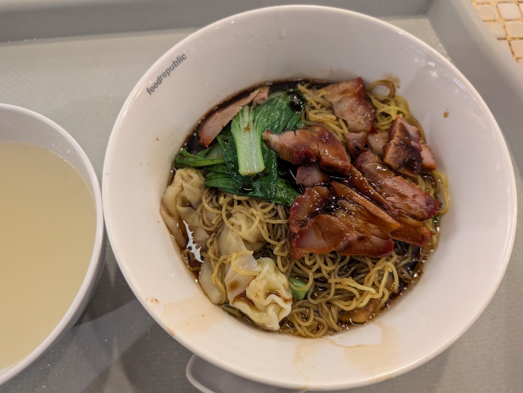 購入したのはワンタンとチャーシューが乗ったドライヌードル「ワンタンミー」(6.3S$)と、サトウキビジュース(2.5S$)です。数あるローカルフードの中でも、中華系のメニューは日本人の口に合いやすいので、シンガポール初心者の方には比較的お勧めできます。