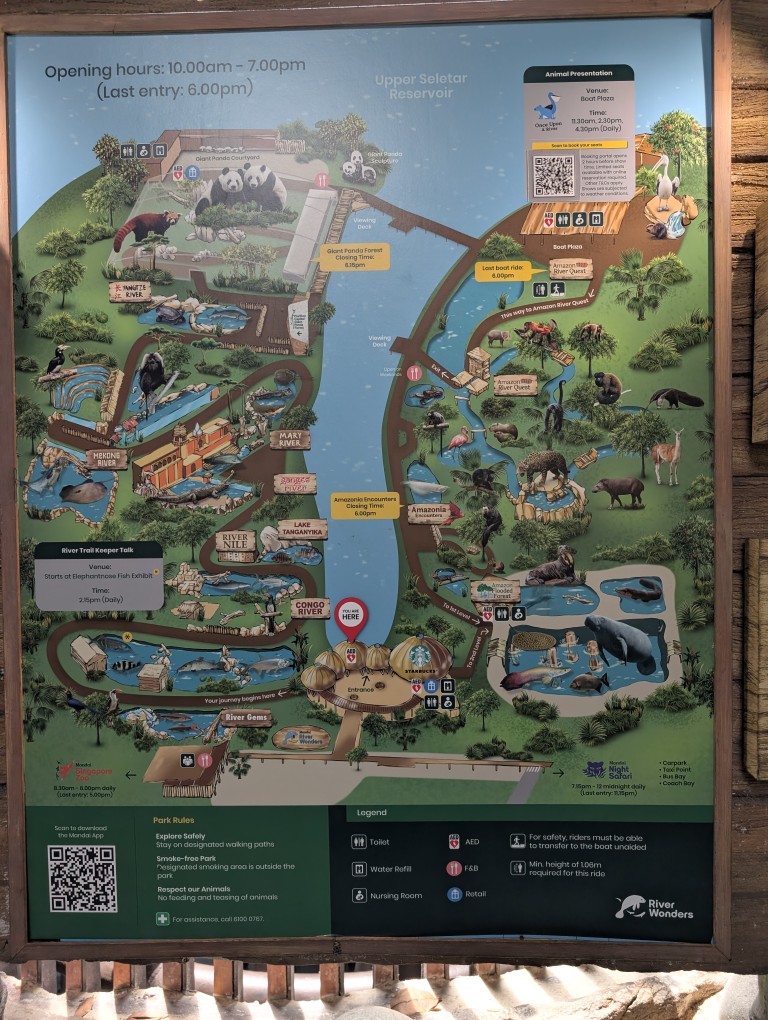 筆者はナイトサファリには何度か来たことがありますが、他は行ったことがなかったので、今回はリバーワンダーを訪問してみることにしました。入場料は後述する「リバークエスト」を含めて45S$で、なかなかのお値段です。チケットはパークの公式サイト上で購入でき、購入後に表示される画面を提示すれば入場できます。