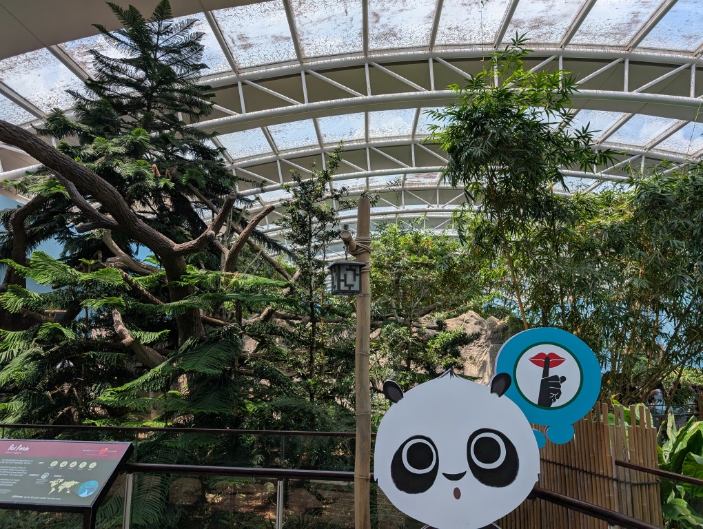 パンダの生息する四川の山間部の気候を再現するため、展示エリアは大きなドームとなっていて、中は非常に涼しくなっています。屋外は屋根があるとはいえそこそこ暑いので、ドーム内の涼しさが有難く感じられます。