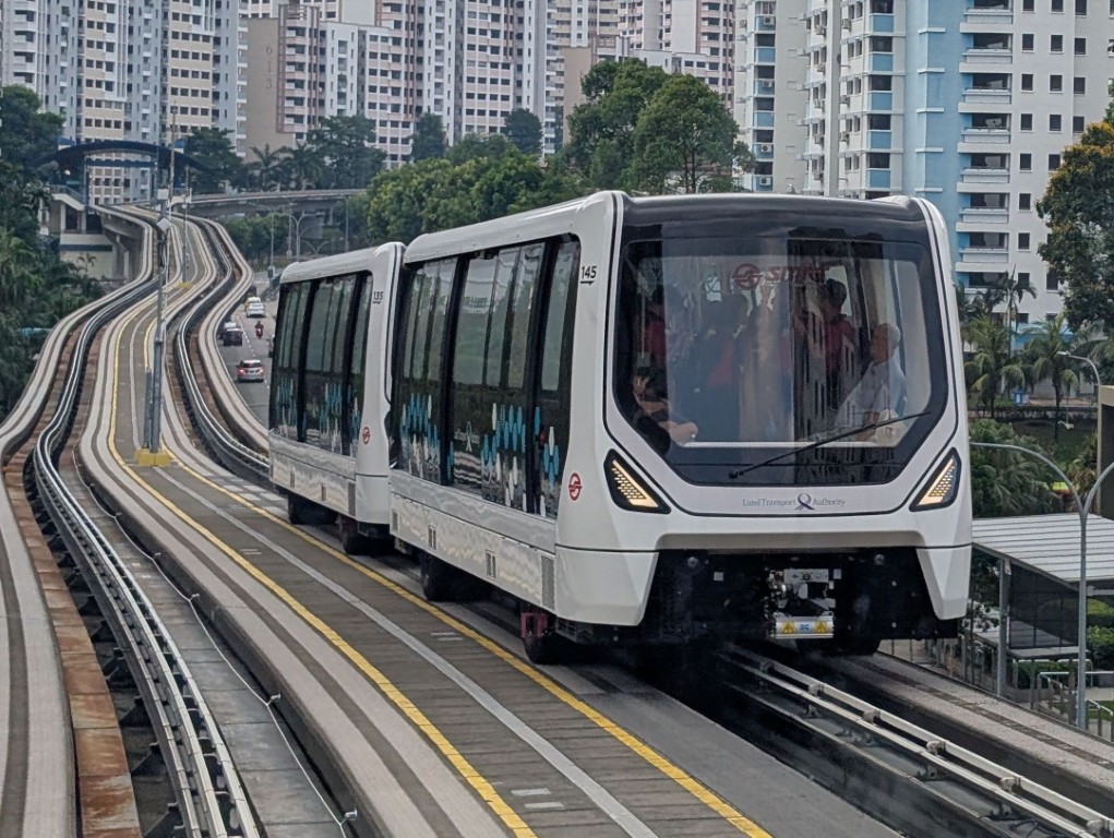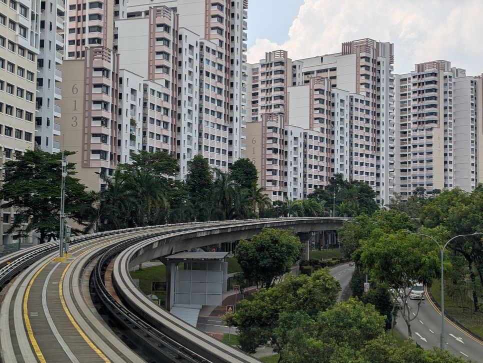見ての通り、車窓は高層の公共住宅(HDB)が延々と続きます。建物のベランダ近くを走る際は、側面窓にスモークが掛かる仕組みになっています。この仕組みも六甲ライナーあたりにもあったような。