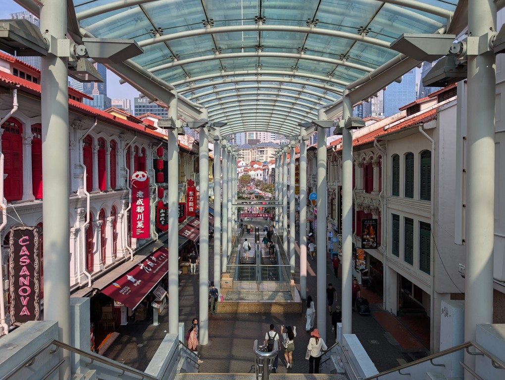 シンガポールのチャイナタウンは中国風の建物一辺倒という訳ではなく、ペラナカン様式の建物内に中華系のお店が並ぶスタイルとなっています。駅前から延びる通りは綺麗に再開発され、お土産屋さんが立ち並んでいていかにも観光地、という雰囲気です。