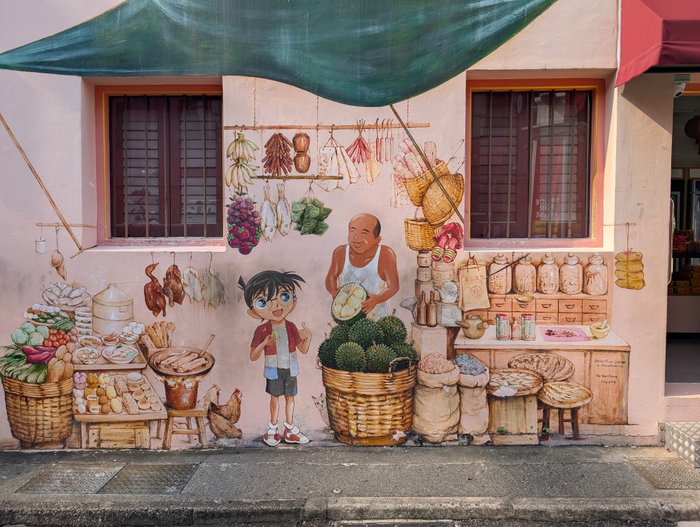 昨年も訪問したスリマリアマン寺院は、お祈りの時間が終わったからか人が少なく閑散としていました。そのすぐ近くには、名探偵コナンの姿が描かれた建物が。シンガポールを舞台にした映画を製作した記念に描かれたのだとか。