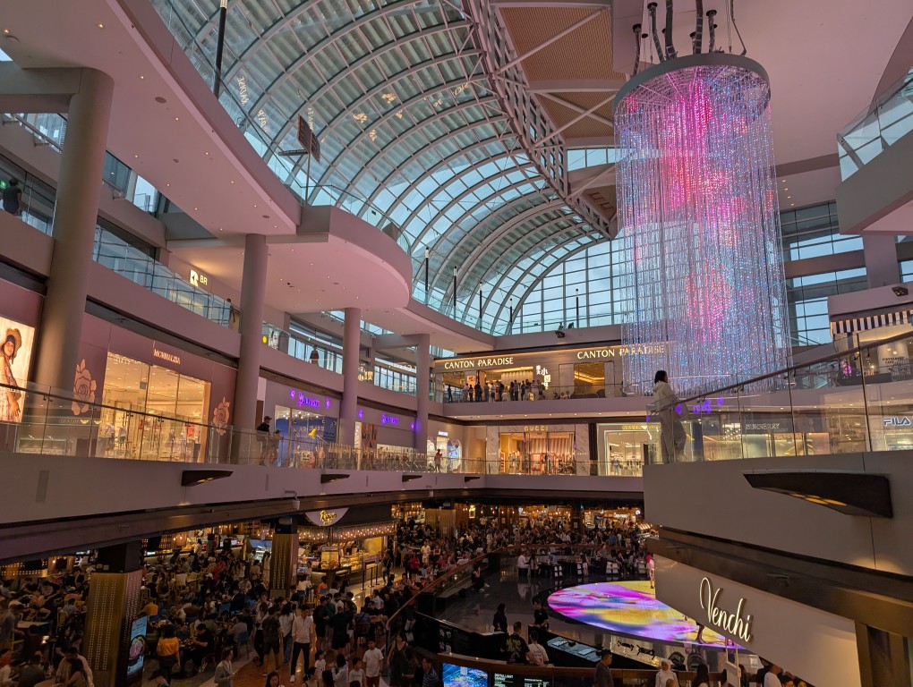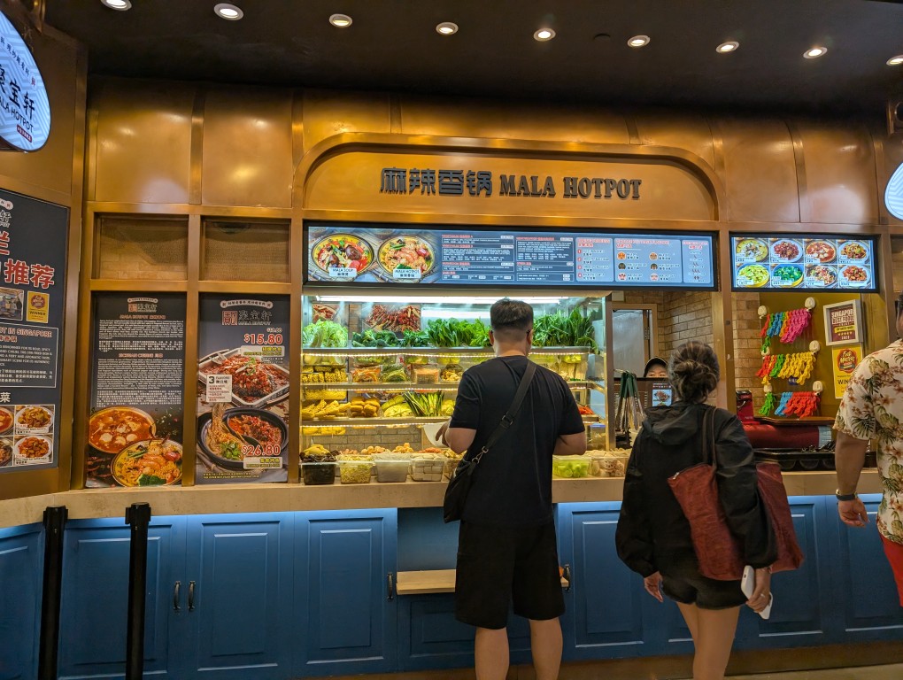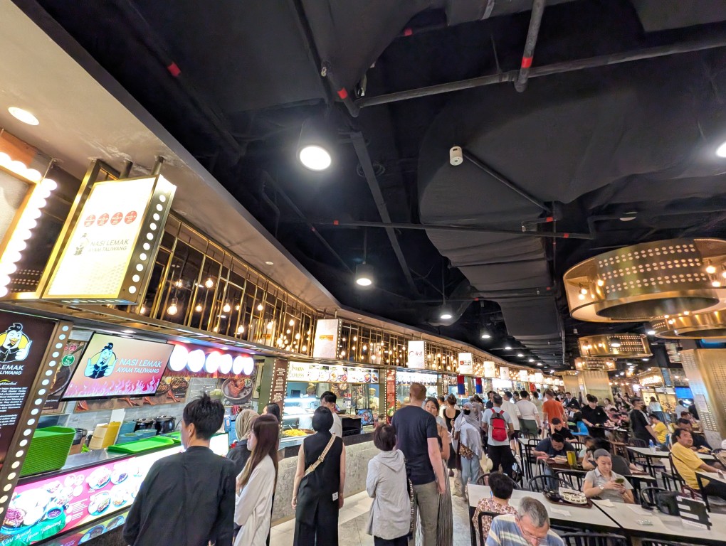 MRTに乗りまくった後、マリーナベイサンズに戻ってくると時刻は18時。ショーまではまだ時間があるので、ショッピングモールの北端にあるフードコートで夕食を食べることにします。フードコートは巨大な吹き抜けの地下にあり、これまで見てきたフードコートと比べても非常に広いです。