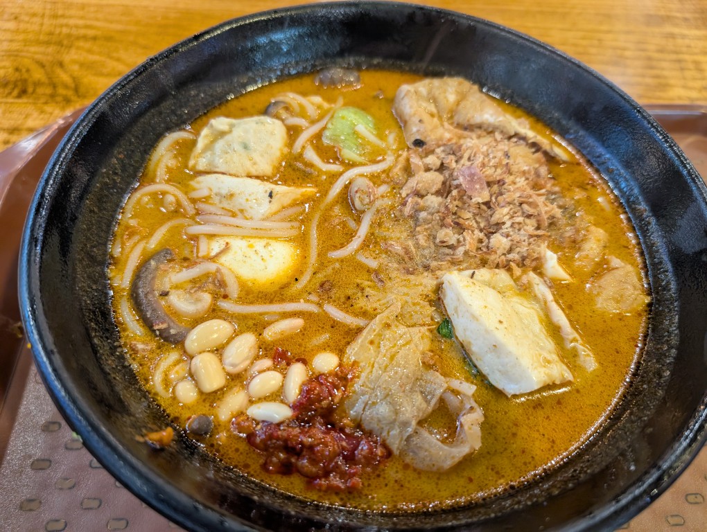 フードコートの店舗の数はこれまで見てきたどこよりも多く、優に20店舗は超えているでしょうか。間口4mほどの店がずらっと並ぶ姿は圧巻です。筆者は先ほどカトンでラクサを食べ損ねたので、ここで食べることにします。店先に並んだショーケースから好きな具を取り、レジで渡して注文する仕組みでした。