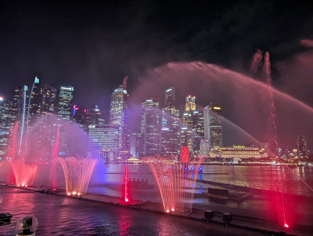 沖合に浮かぶマーライオン像が赤く光り出すと、ショーが始まります。