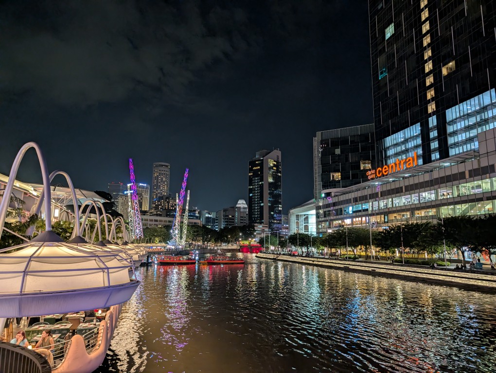 クラークキー(と、それに連なるボートキー)は、シンガポール川沿いに並ぶ飲食店街で、レストラン・バー・お土産屋が立ち並んでいます。熱帯なので川の水は真っ茶色ですが、川からマリーナベイサンズあたりまでを周遊する観光船がひっきりなしに通過していました。