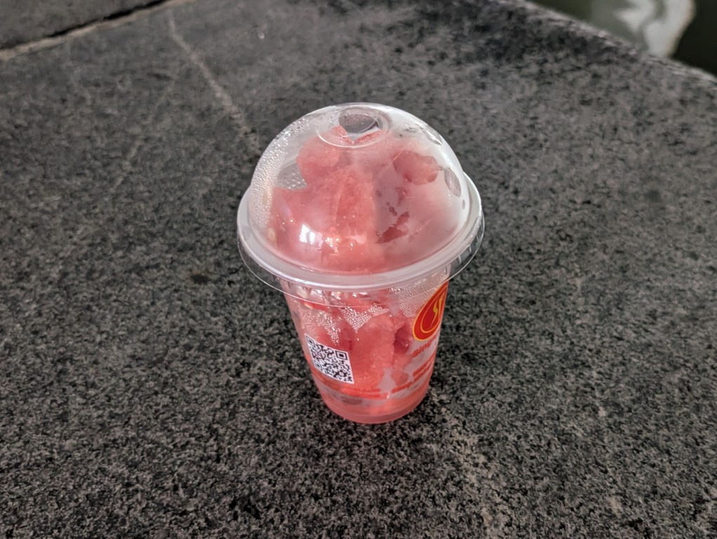 道沿いのバーでは一人酒を飲む欧米系の観光客も結構いて、筆者も思わずビールが飲みたくなりましたが、海外で酔っ払ってやらかすと大変なので、カップに入ったスイカを買って水分補給をします。